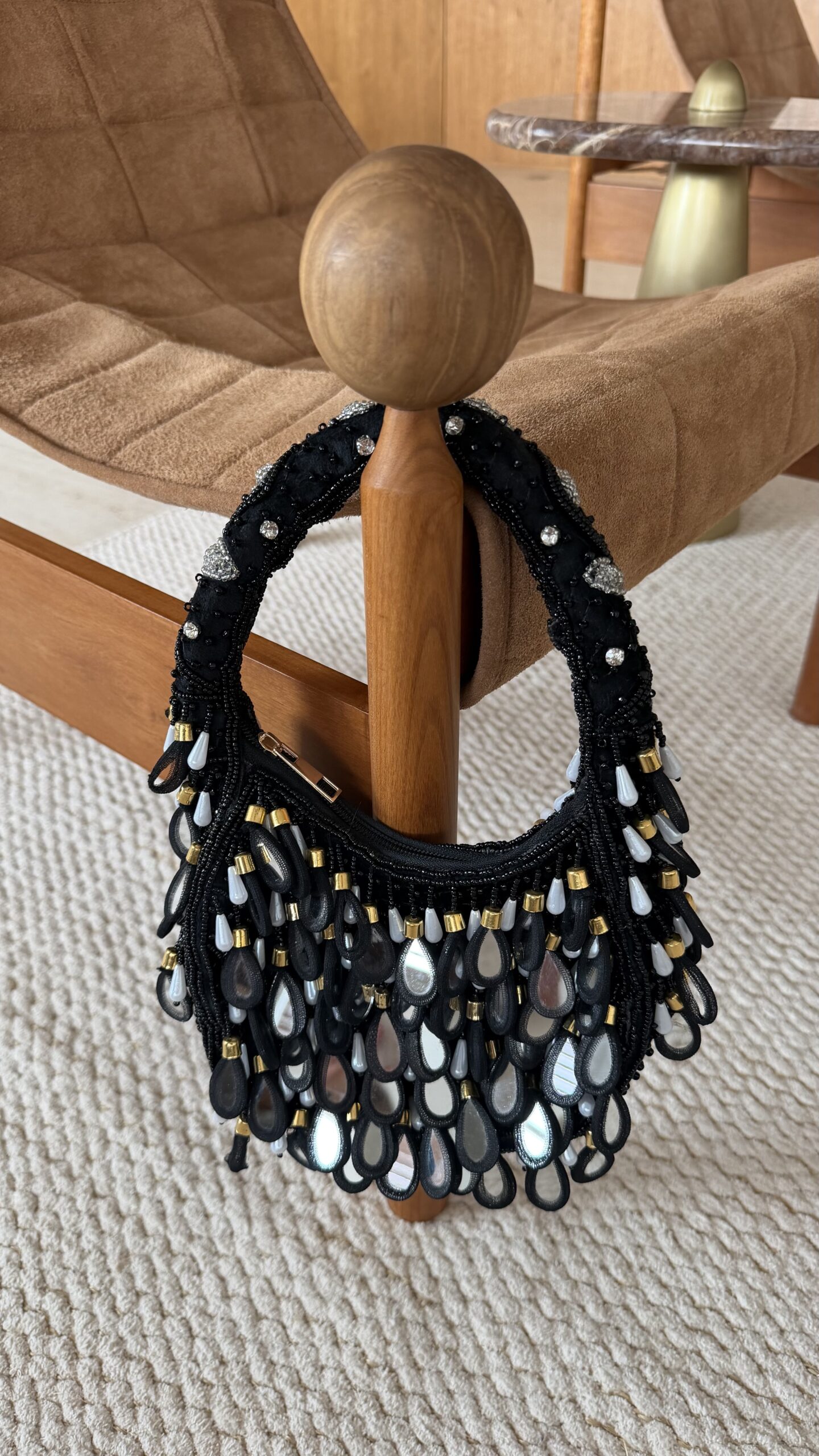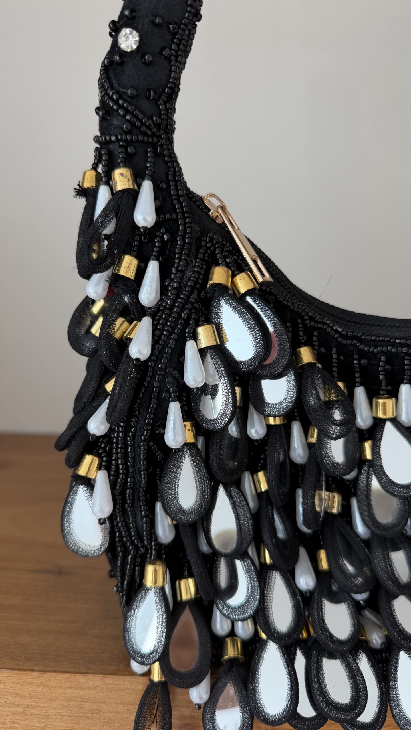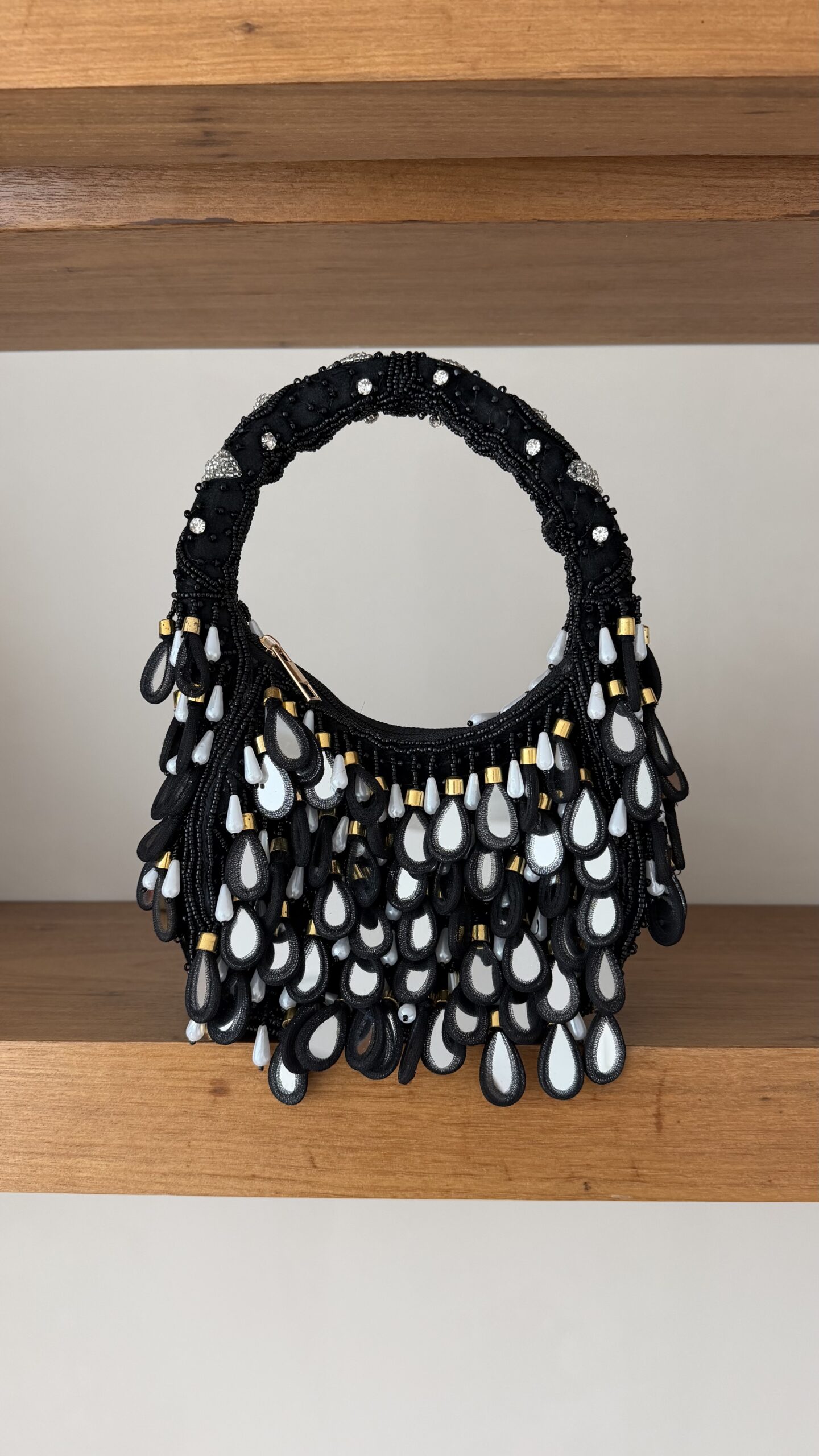 A Bolsa Mila Black é o destaque ideal para elevar qualquer produção. Com design sofisticado, ela é toda bordada em miçangas pretas e ganha charme extra com aplicações em formato de gotas nos tons preto, branco perolado e detalhes dourados, que trazem movimento e elegância ao look.