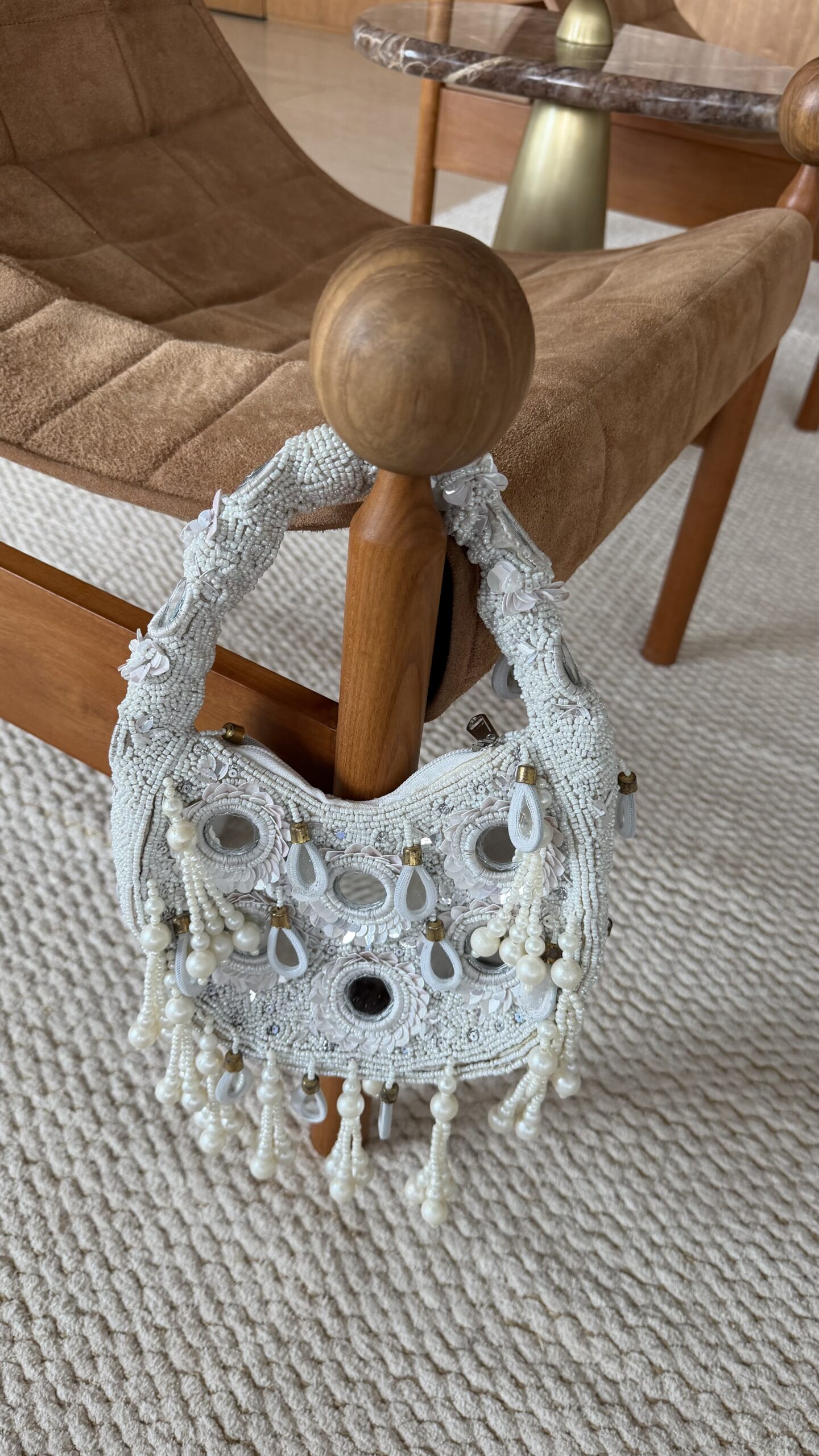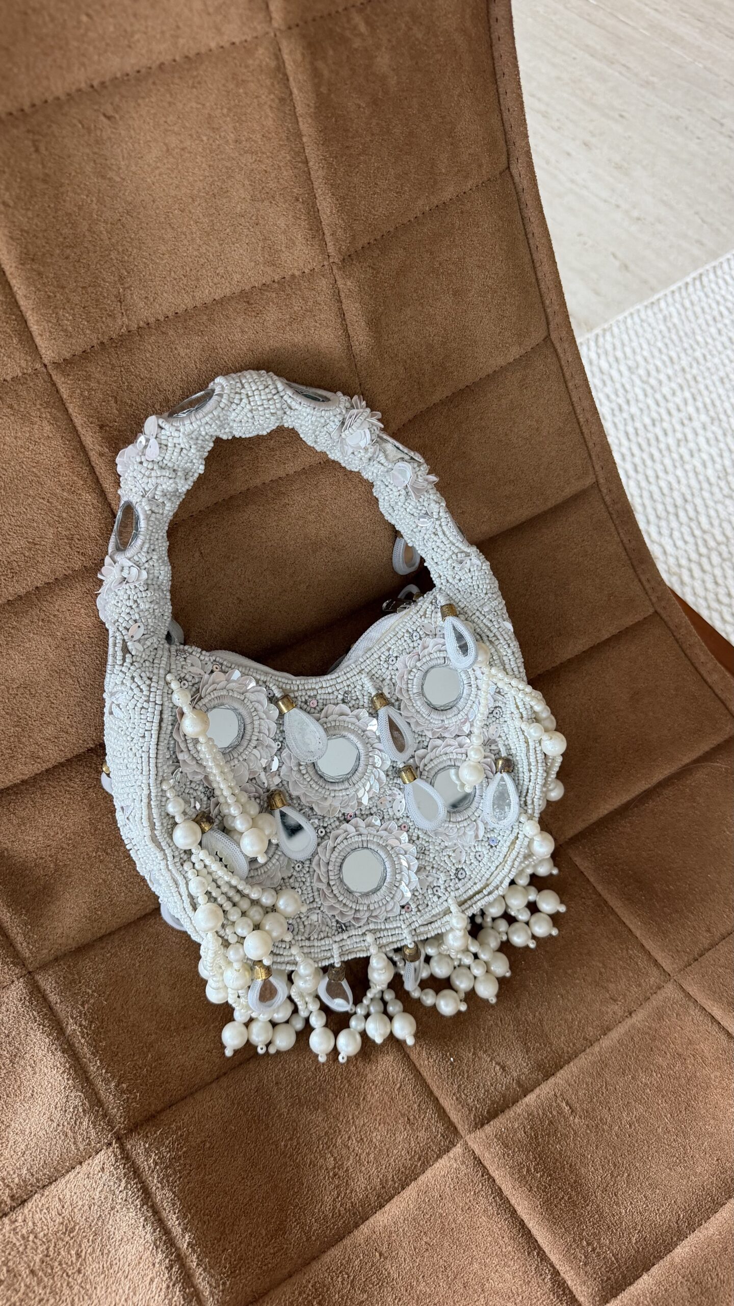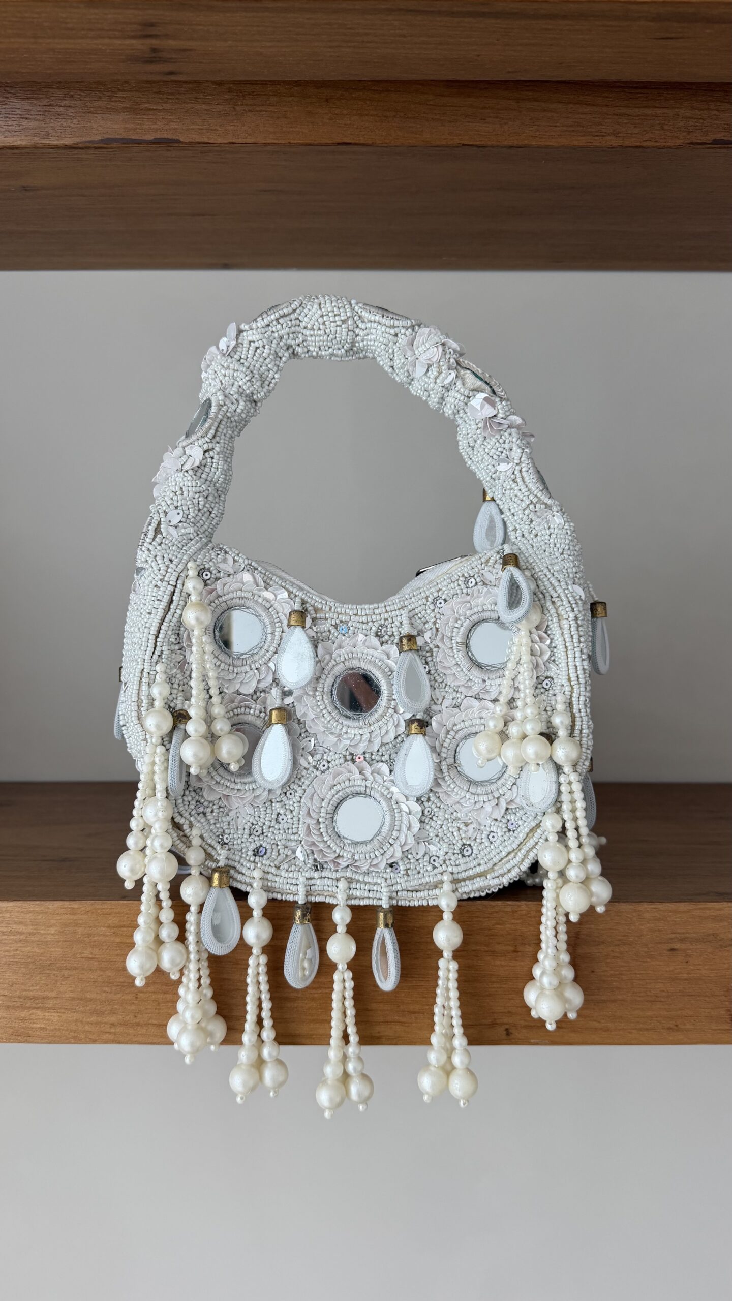 A Bolsa Yara é uma peça vibrante e cheia de personalidade. Bordada em miçangas brancas, se destaca pelas aplicações e pingentes que criam movimento e um visual único, perfeito para quem busca um acessório protagonista.