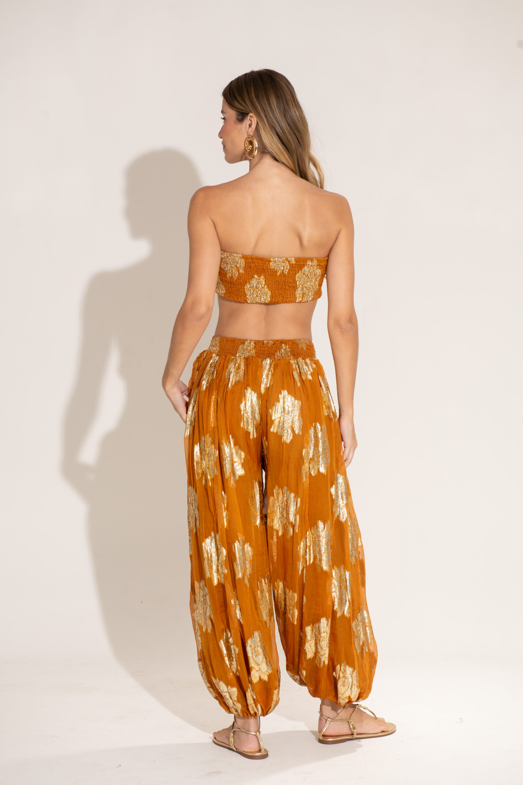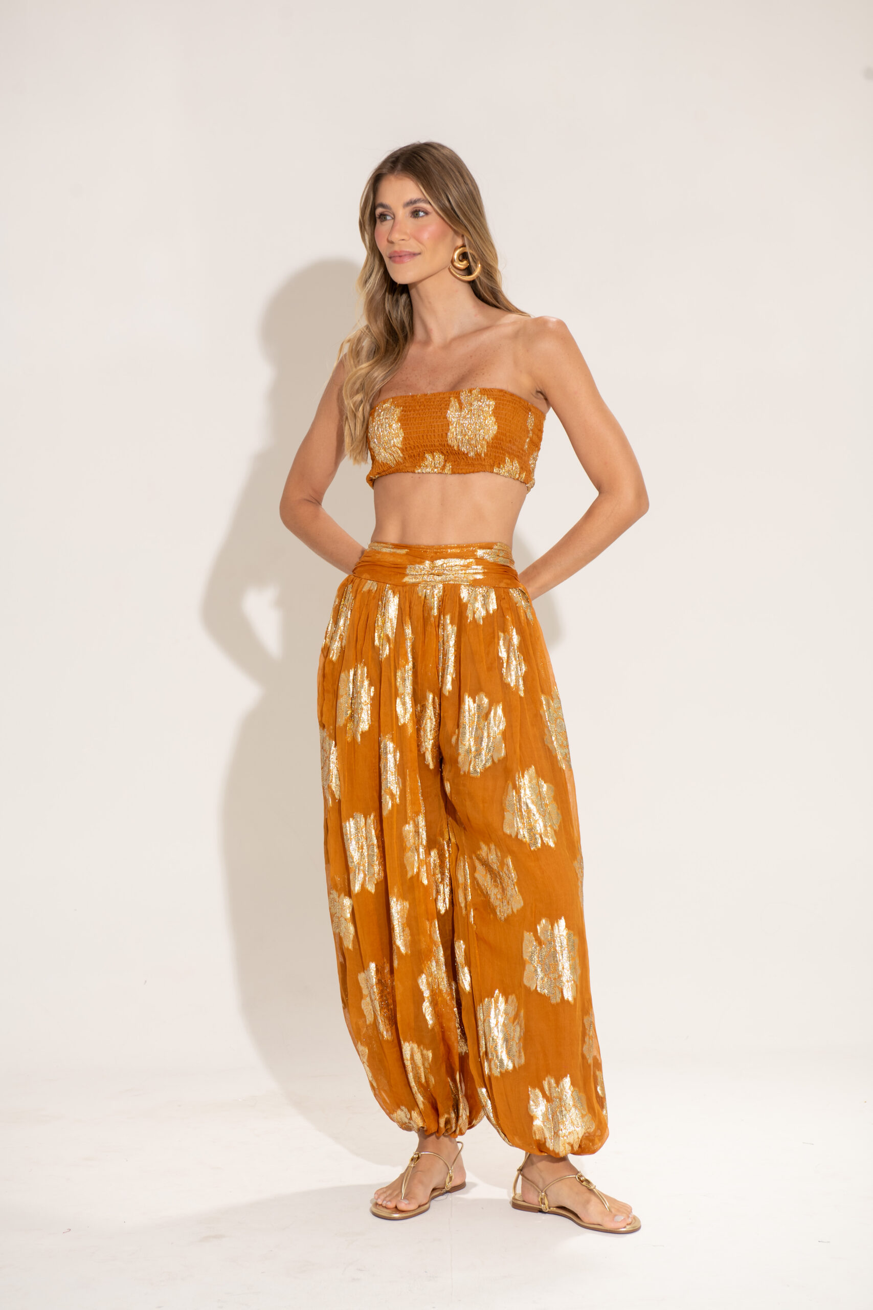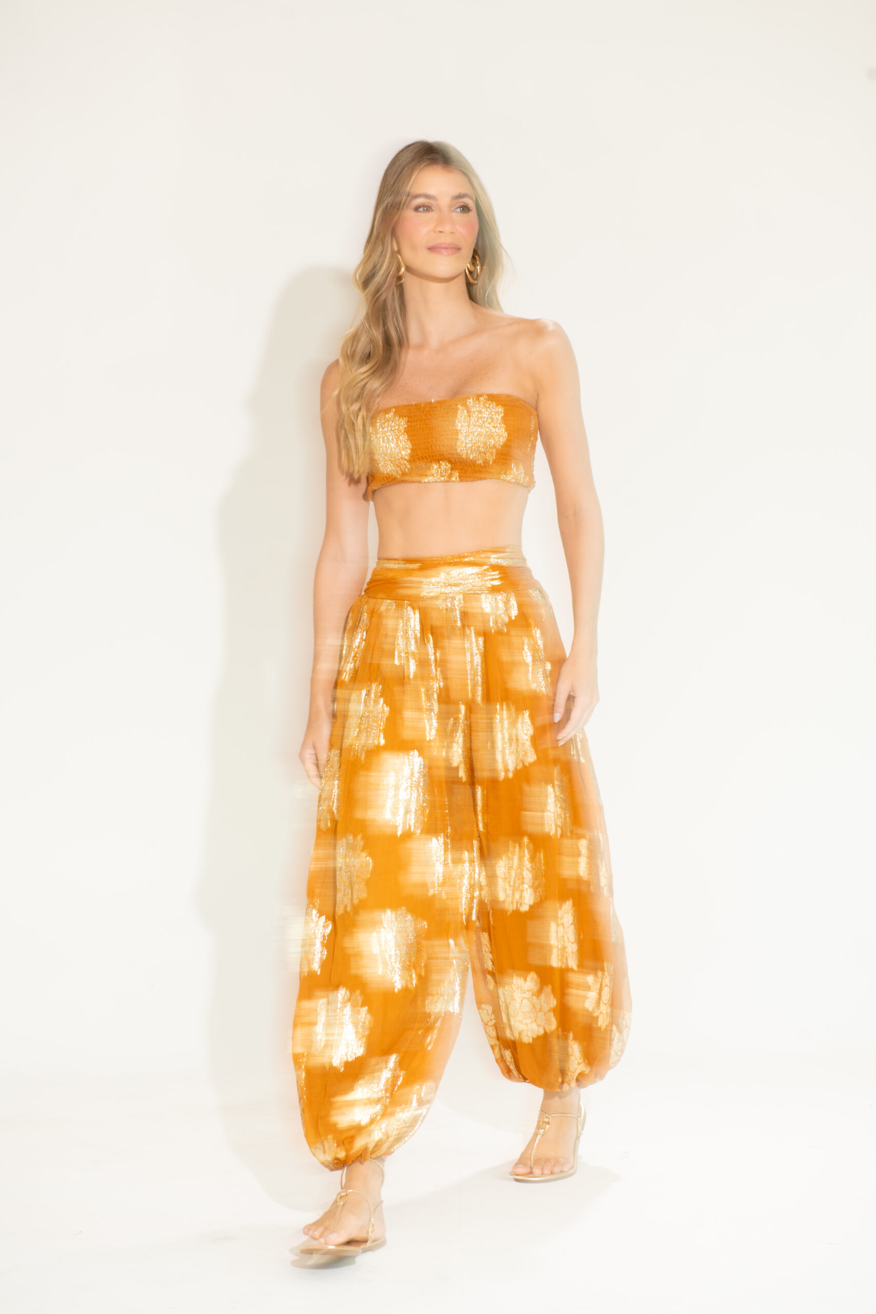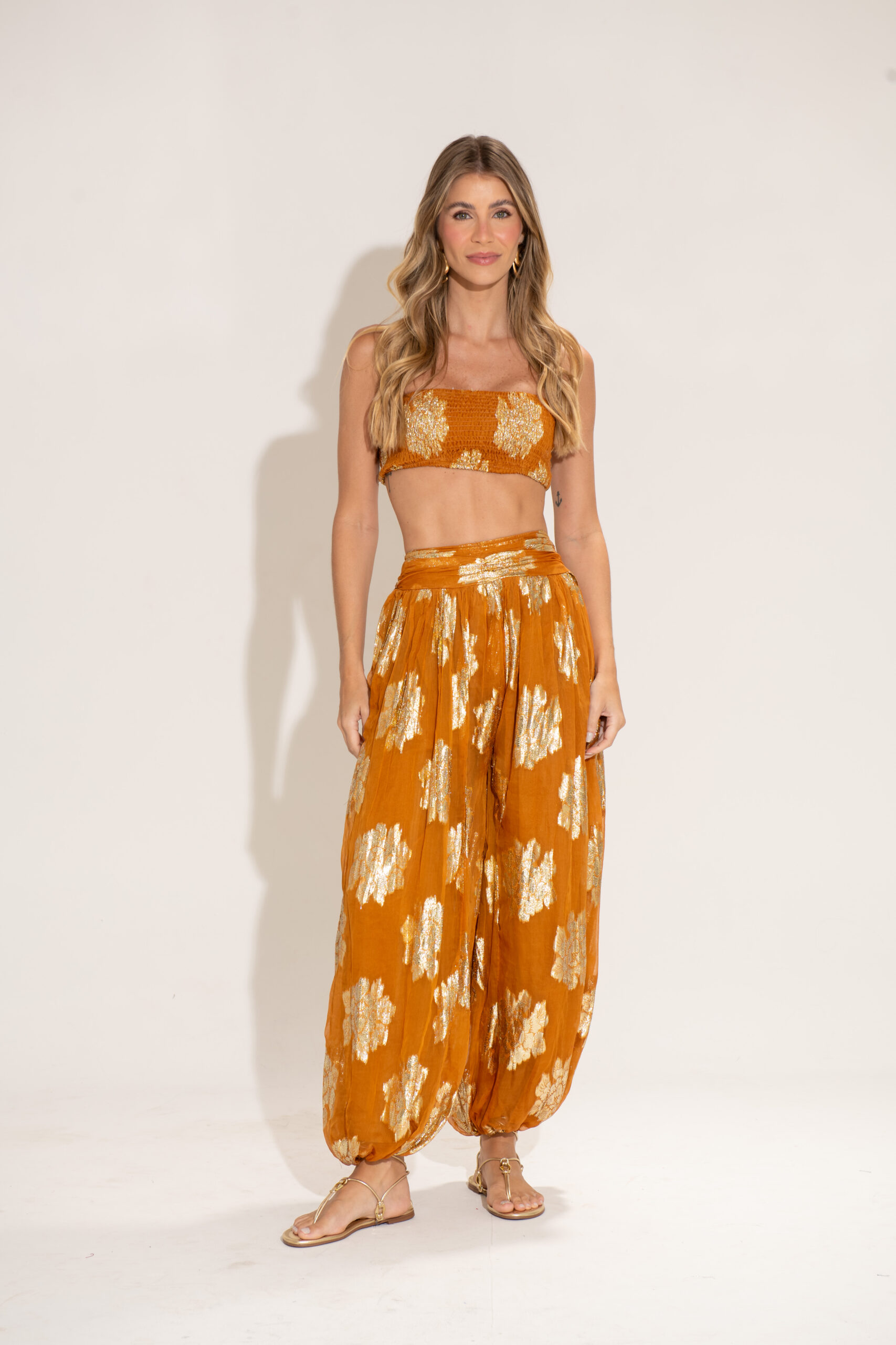 O Conjunto Jasmin é pura elegância e conforto. Feito em tecido leve com brilho dourado, ele traz um toque sofisticado e moderno ao look. O top faixa ajustado valoriza o busto com um caimento perfeito, enquanto a calça ampla com elástico na barra garante movimento e fluidez. Ideal para ocasiões especiais, viagens ou produções de verão cheias de estilo.