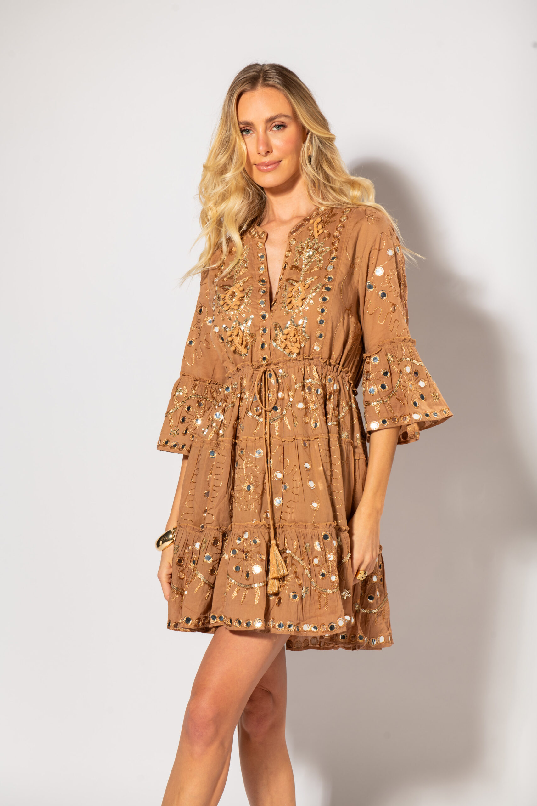 O vestido perfeito para quem busca leveza, sofisticação e um toque artesanal. Em tom caramelo, este modelo apresenta bordados ricos em detalhes com aplicações de pedrarias e espelhos, criando um visual autêntico e elegante. A modelagem soltinha com ajuste na cintura valoriza a silhueta com conforto e feminilidade.