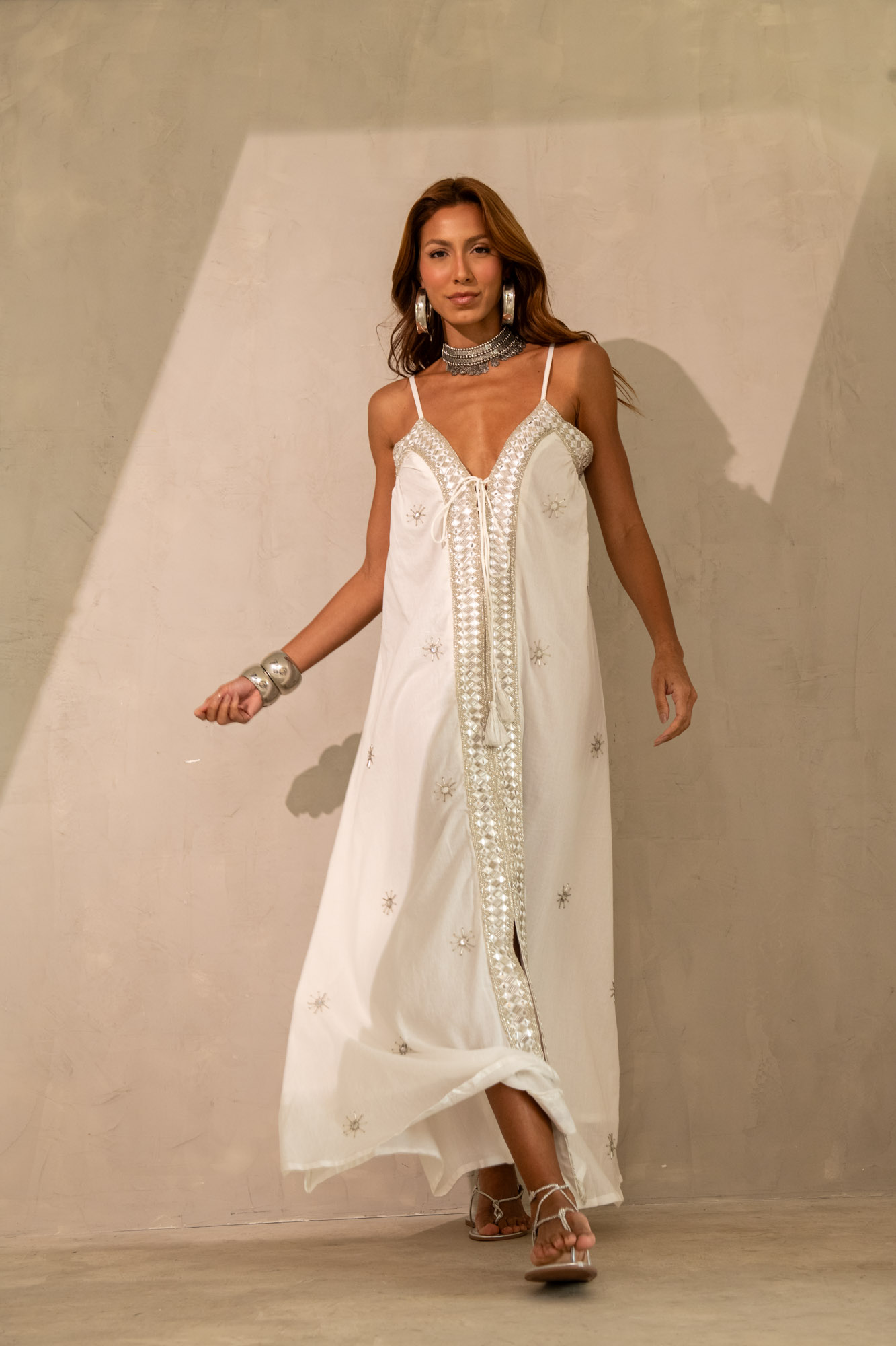 Um vestido longo de estilo boho chic, com modelagem solta e fluída, confeccionado em tecido leve e confortável. Apresenta alças finas ajustáveis e um decote em “V” com detalhe de amarração frontal. O destaque fica por conta dos bordados prateados em formas de pequenos sóis espalhados por toda a peça, além de uma faixa bordada vertical que valoriza o comprimento do corpo.