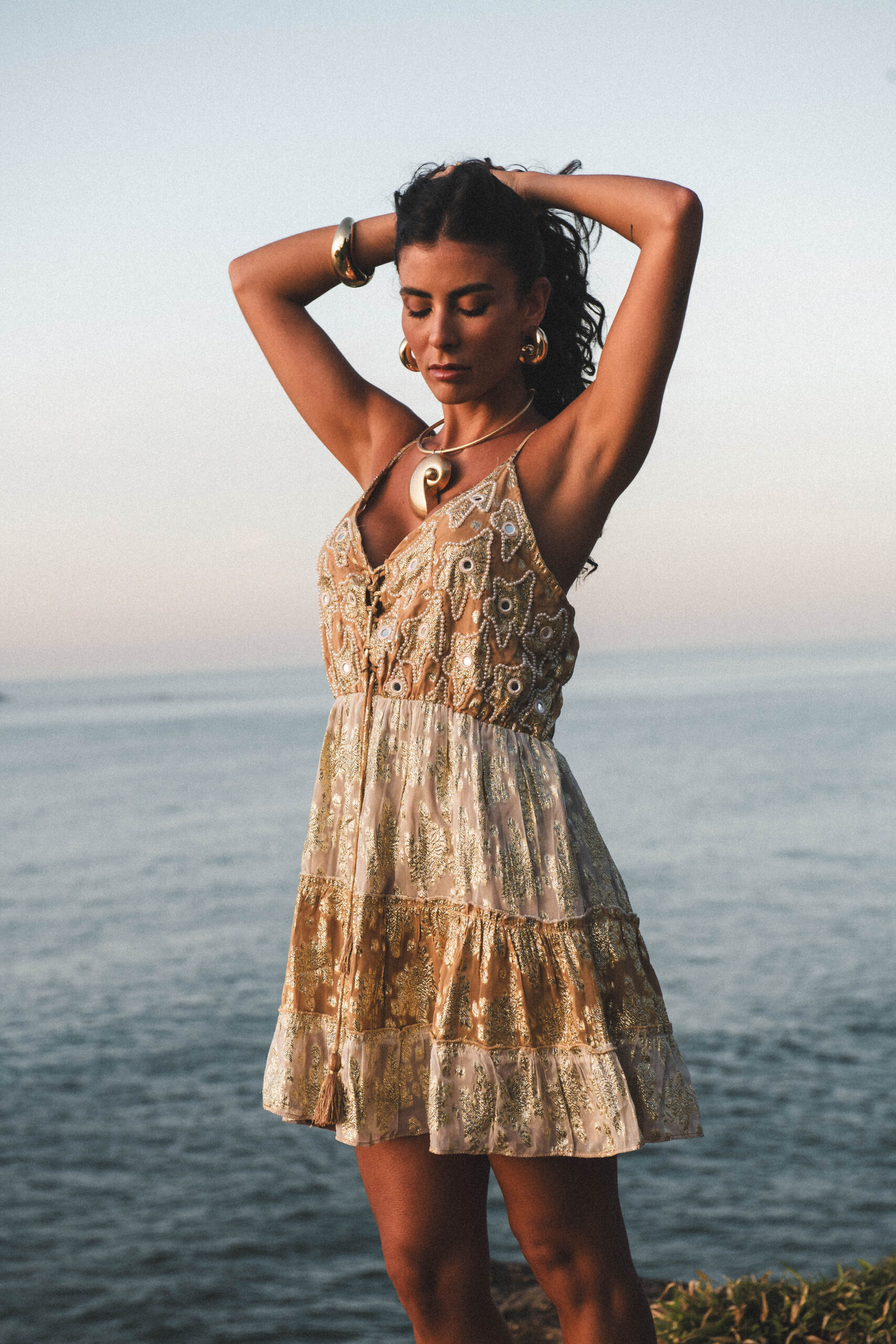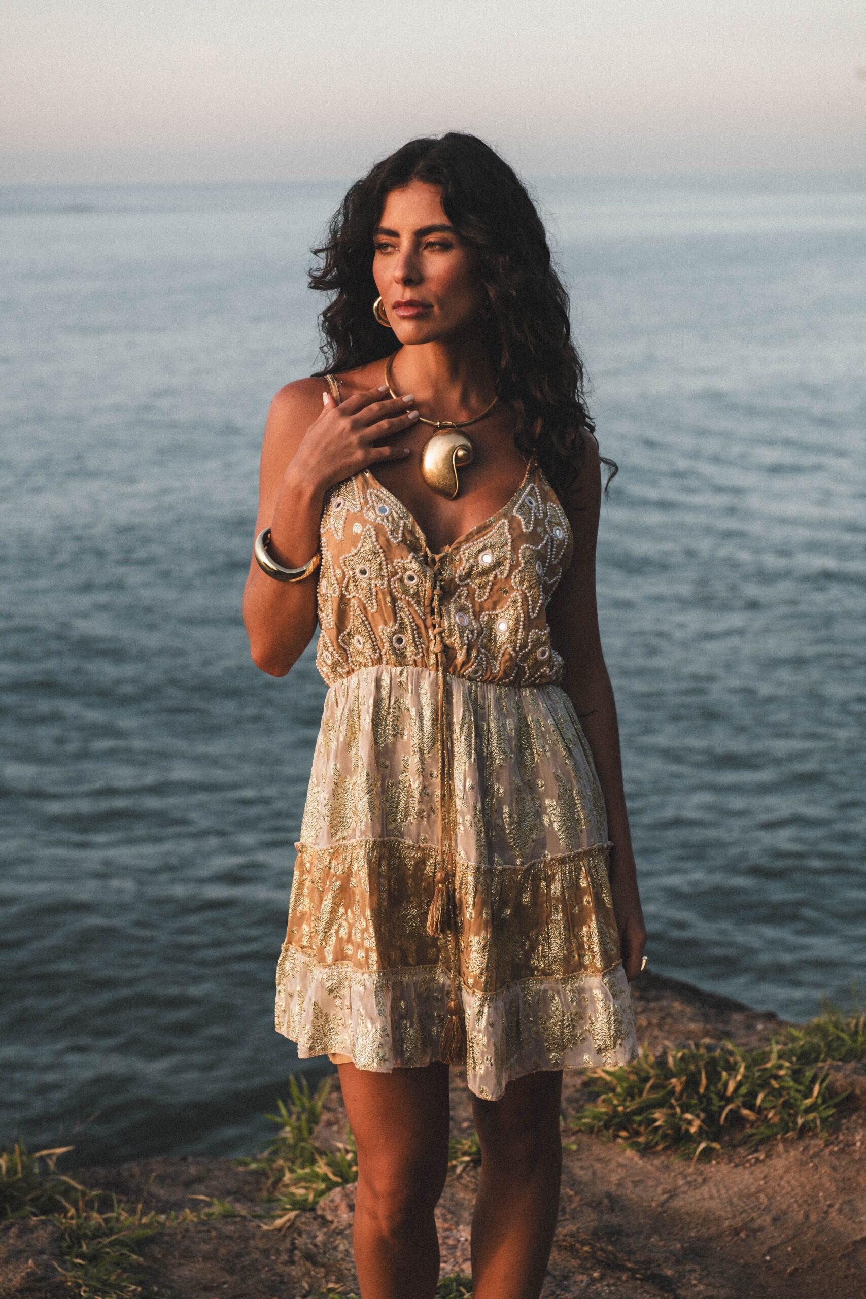 Vestido Luna curto em tom dourado com bordados artesanais ricos em detalhes, perfeito para ocasiões especiais à beira-mar ou eventos ao ar livre. O modelo combina leveza, sofisticação e um toque boho chic, com acabamento impecável e brilho elegante na medida certa.