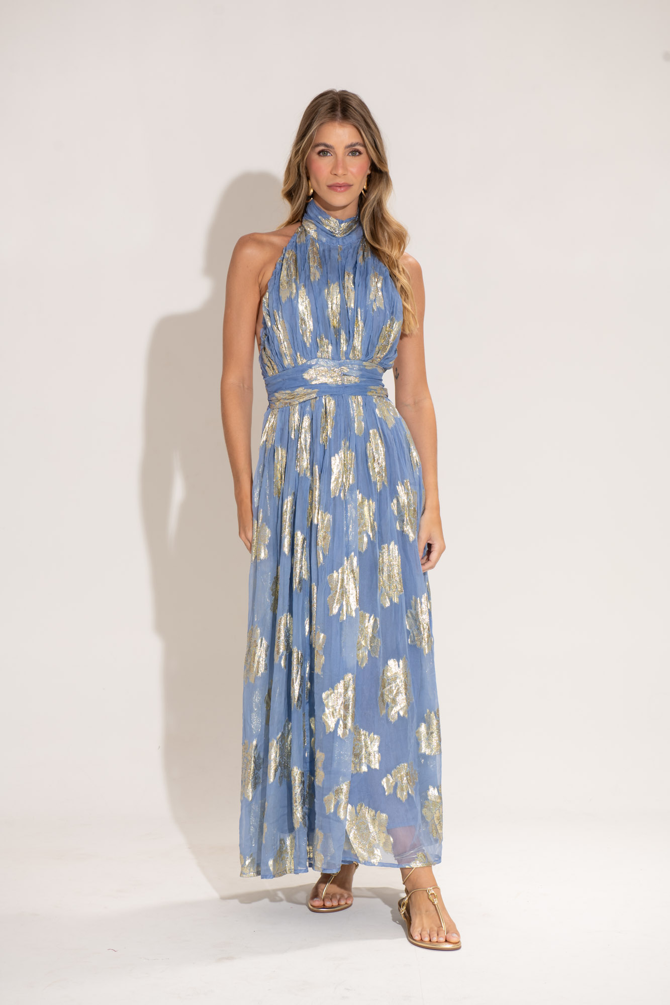 O vestido zaya longo é a peça perfeita para quem busca elegância e leveza. Confeccionado em tecido fluido com toque acetinado, possui estampa metalizada que adiciona um brilho sofisticado ao look. Seu design apresenta gola alta drapeada, cintura marcada e saia levemente rodada, criando um caimento impecável e feminino.