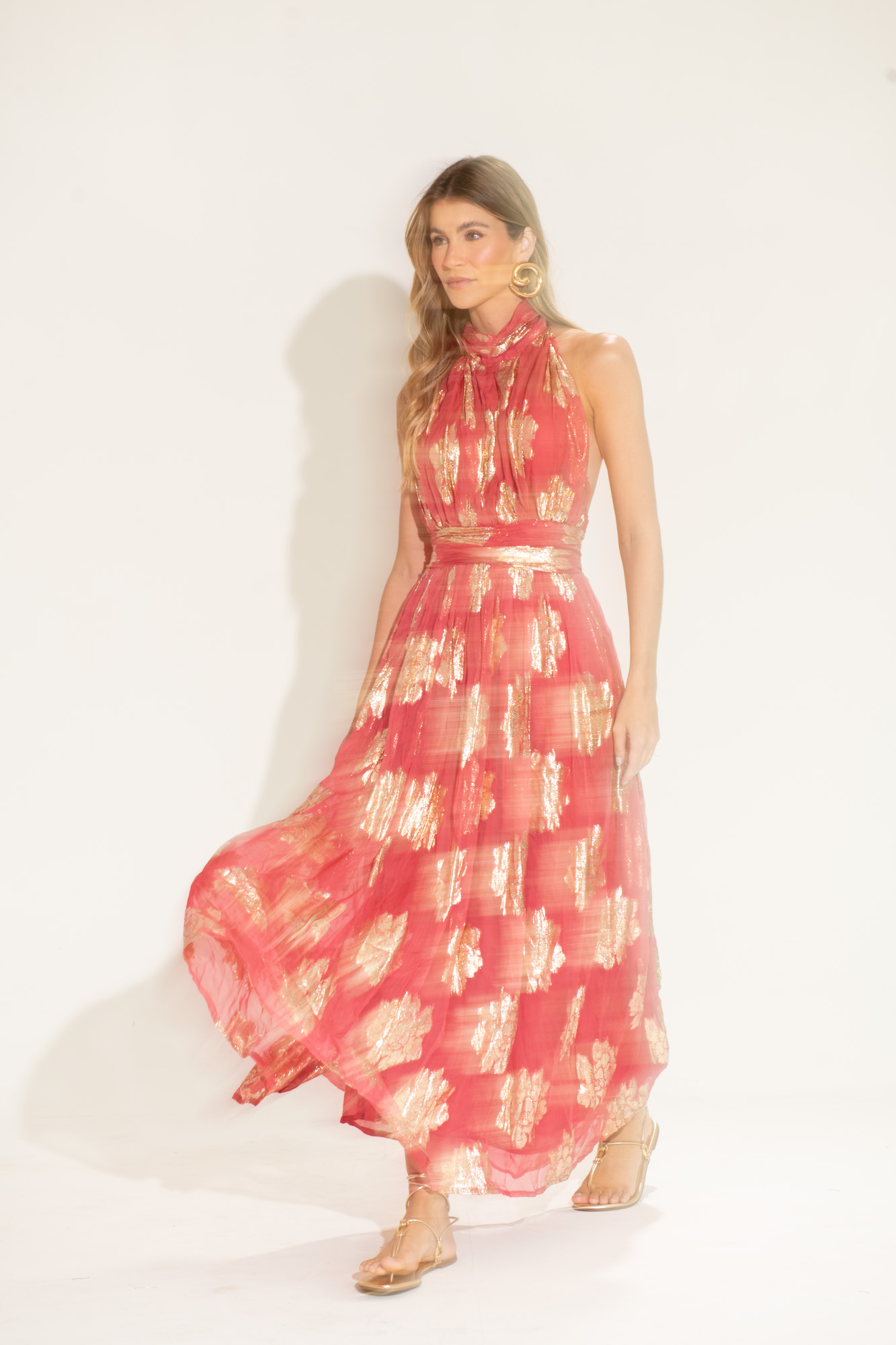 O vestido zaya longo é a peça perfeita para quem busca elegância e leveza. Confeccionado em tecido fluido com toque acetinado, possui estampa metalizada que adiciona um brilho sofisticado ao look. Seu design apresenta gola alta drapeada, cintura marcada e saia levemente rodada, criando um caimento impecável e feminino.