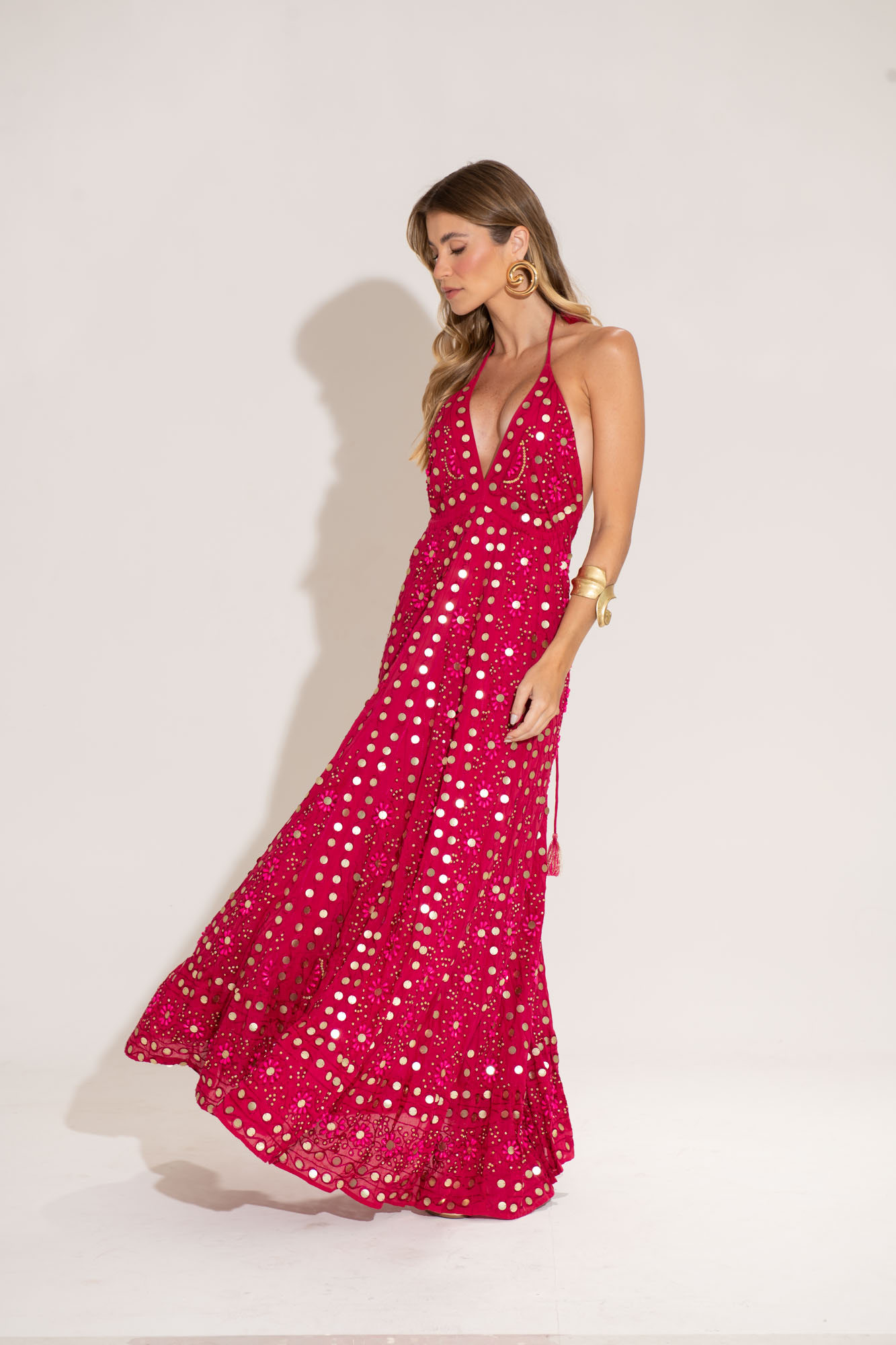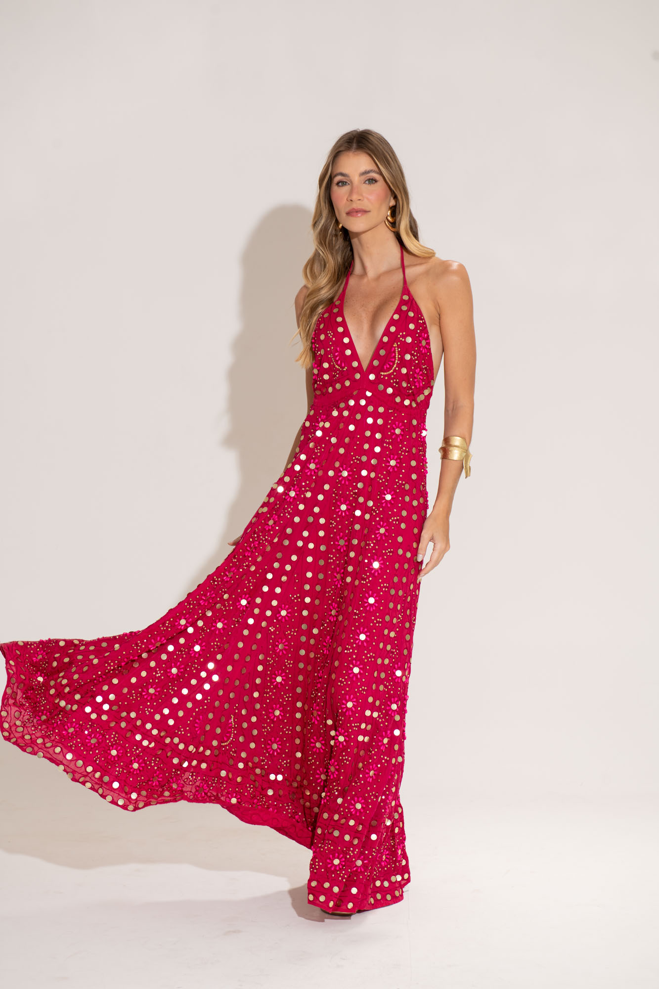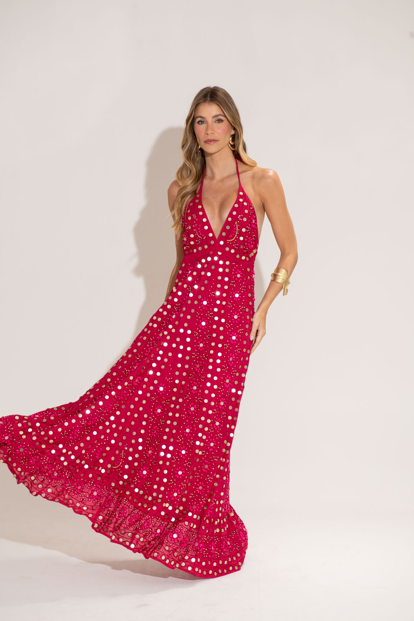 Vestido longo com modelagem fluida e shape esvoaçante. Possui decote profundo halter, aplicações metálicas espelhadas e bordados florais em alto-relevo que trazem brilho e textura. Uma peça sofisticada, com movimento leve e acabamento artesanal.