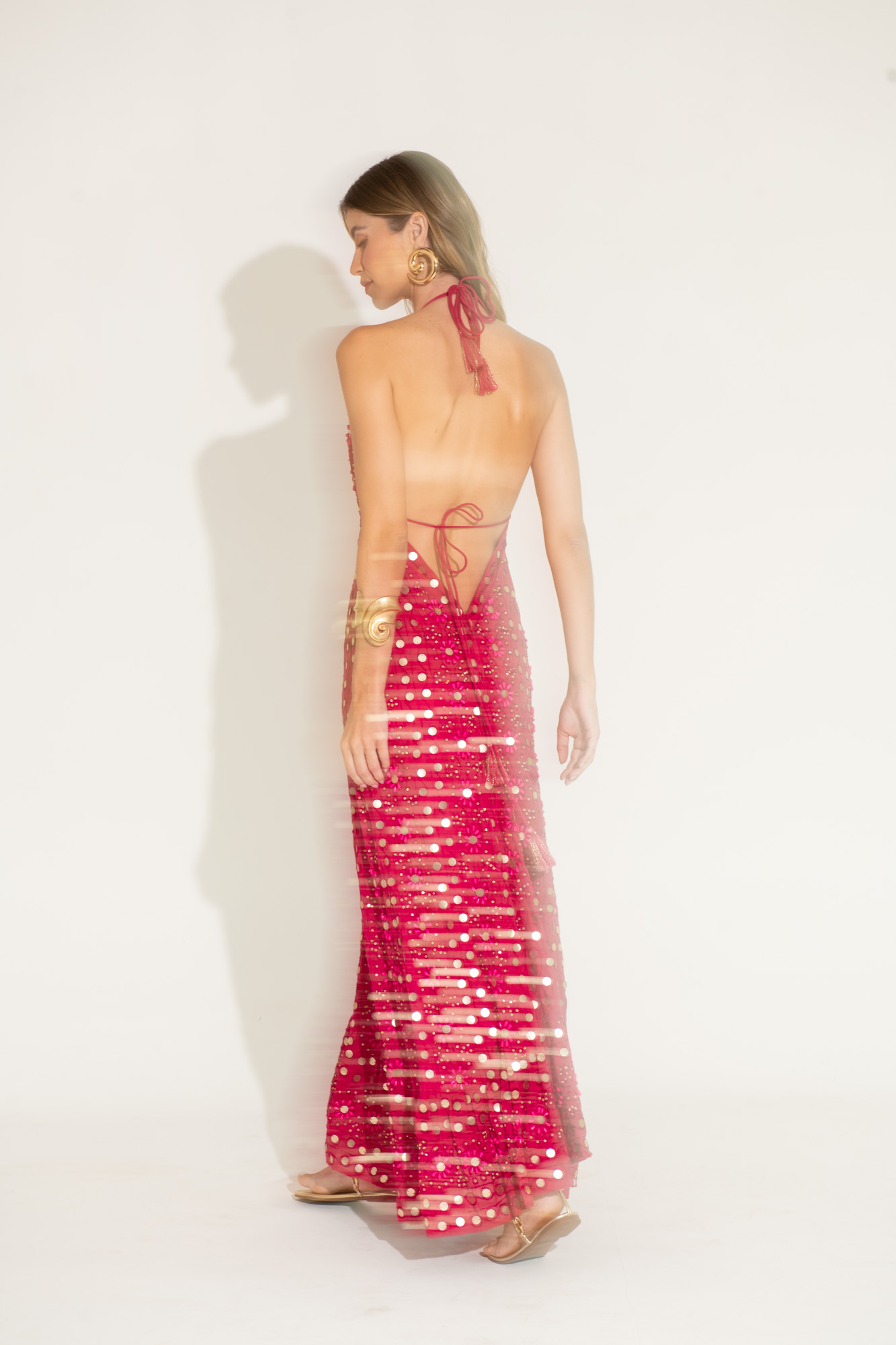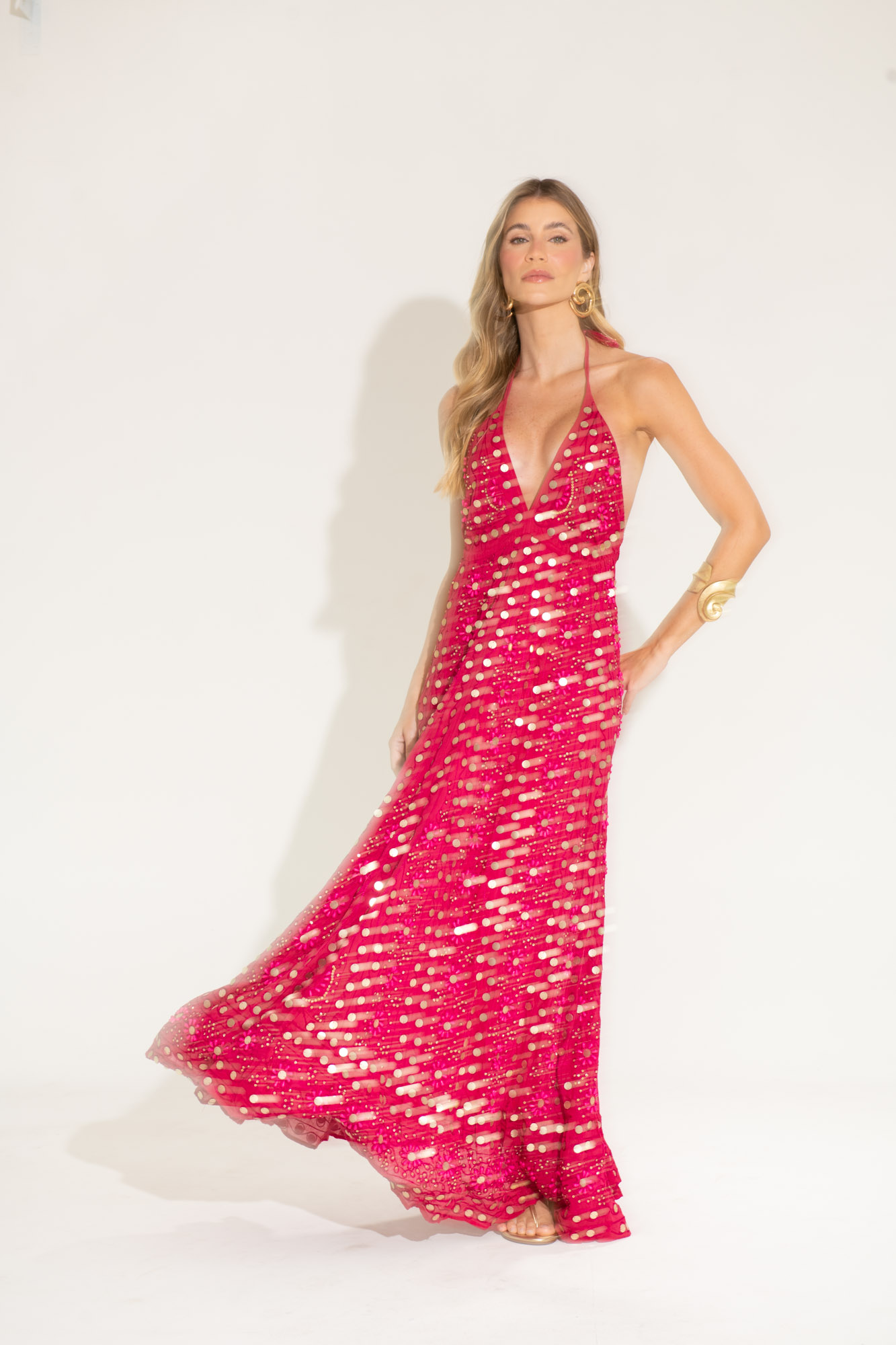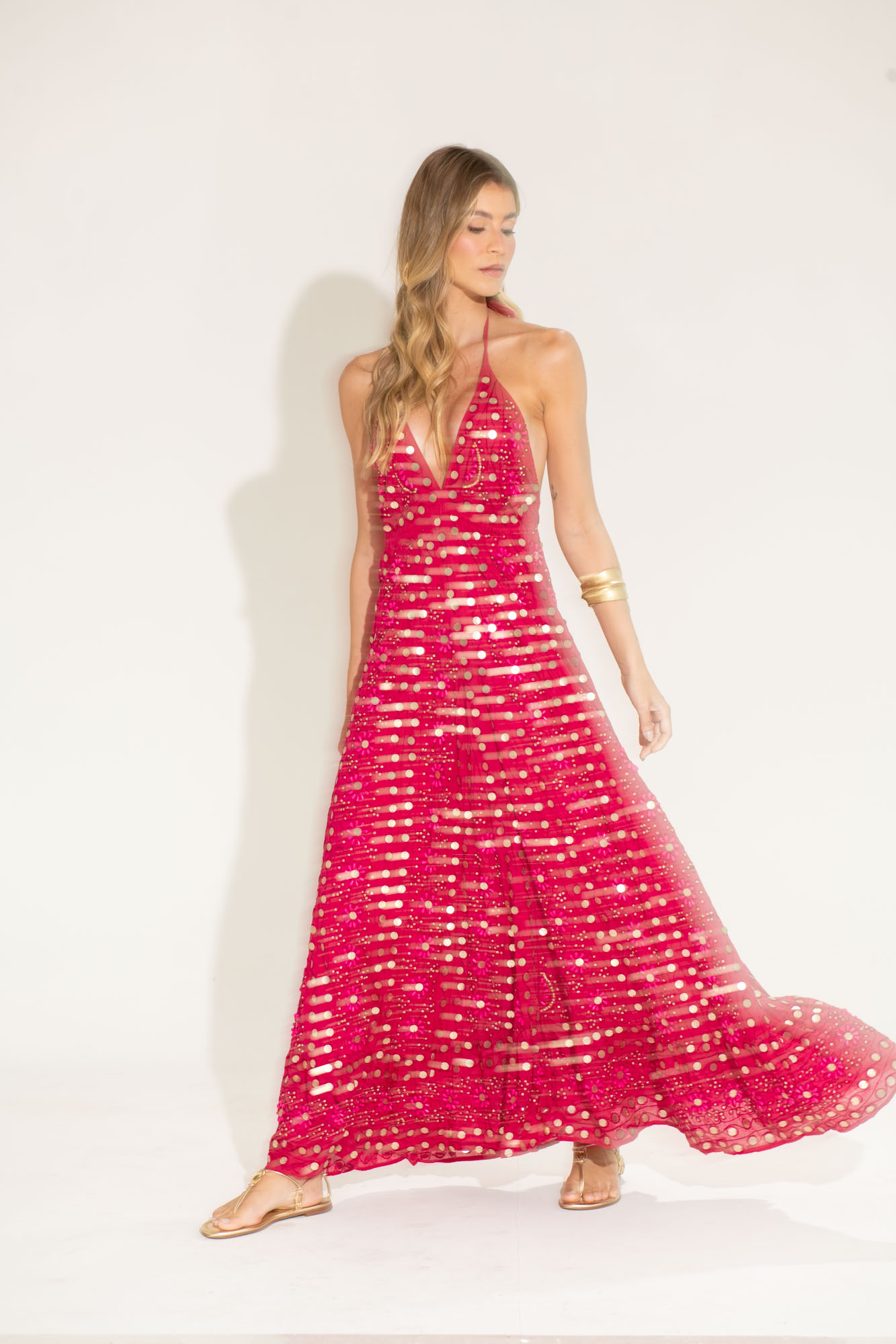 Vestido longo com modelagem fluida e shape esvoaçante. Possui decote profundo halter, aplicações metálicas espelhadas e bordados florais em alto-relevo que trazem brilho e textura. Uma peça sofisticada, com movimento leve e acabamento artesanal.